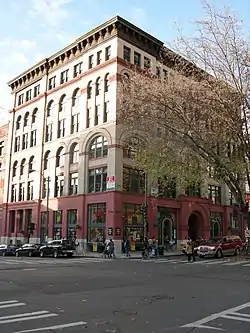 The Mutual Life Building, originally known as the Yesler Building, is an historic office building located in Seattle's Pioneer Square neighborhood that anchors the West side of the square. The building sits on one of the most historic sites in the city; the original location of Henry Yesler's cookhouse that served his sawmill in the early 1850s and was one of Seattle's first community gathering spaces. It was also the site of the first sermon delivered and first lawsuit tried in King County. By the late 1880s Yesler had replaced the old shanties with several substantial brick buildings including the grand Yesler-Leary Building, which would all be destroyed by the Great Seattle Fire in 1889. The realignment of First Avenue to reconcile Seattle's clashing street grids immediately after the fire would split Yesler's corner into two pieces; the severed eastern corner would become part of Pioneer Square park, and on the western lot Yesler would begin construction of his eponymous block in 1890 to house the First National Bank, which had previously been located in the Yesler-Leary Building. Portland brewer Louis Feurer began construction of a conjoined building to the west of Yesler's at the same time. Progress of both would be stunted and the original plans of architect Elmer H. Fisher were dropped by the time construction resumed in 1892. It would take 4 phases and 4 different architects before the building reached its final form in 1905. The Mutual Life Insurance Company of New York only owned the building for 13 years (from 1896 to 1909), but it would retain their name even after the company moved out in 1916.