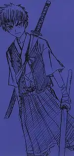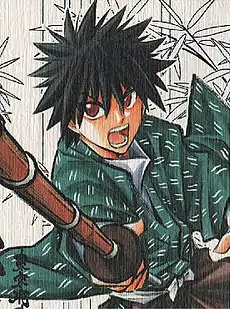 Yahiko starts off as arrogant and bad-mannered; he had already bestowed upon himself the title "Tokyo Samurai", as his father was a samurai who died during the Battle of Ueno in the Boshin War, slain at the Keneiji Temple.[9] Because Yahiko respected his parents, he becomes a thief before the start of the series, to pay back their debt. Yahiko first appears trying to rob Kenshin, who stops him but lets him go. As his yakuza bosses are about to beat him to death for his desire to quit, Kenshin arrives to save him and take him to Kaoru's dojo to learn swordsmanship.[9] Yahiko's dream is to be as strong as Kenshin so he will be able to protect himself and the people he loves.[10] Despite his young age and his short time of training, as the series continues Kenshin allows Yahiko to fight with him, noting that he is too mature for his age.[11] He becomes a witness to many of Kenshin's later battles[12] to the point which Yahiko becomes adept at imitating some of Kenshin's Hiten Mitsurugi-ryū (飛天御剣流, lit. "Flying Heaven Honorable Sword Style") techniques, combining them to perform many other powerful sword techniques.[13][14] Yahiko also learns the principles of Kamiya Kasshin-ryū (神谷活心流, lit. "Gods' Valley Alive Heart Style"), which matches Kenshin's ideal of saving lives. When Kenshin goes to Kyoto to fight Shishio Makoto who wanted to conquer Japan, Yahiko accompanies Kaoru to find and aid Kenshin.[15] While Kenshin goes to have his final fight against Shishio, he stays in Kyoto to defend their base, a hotel named Aoi-ya, from Shishio's forces along with Kaoru and the Oniwabanshū.[16] They are successful in doing it, and Yahiko manages to defeat one of Shishio's strongest soldiers, Henya.[13]