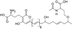 In 2010, a pigment compound isolated and characterized from fruit bodies of Mycena aurantiomarginata was reported as new to science by Robert Jaeger and Peter Spiteller in the Journal of Natural Products. The chemical, mycenaaurin A, is a polyene compound that consists of a tridecaketide (i.e., 13 adjacent methylene bridge and carbonyl functional groups with two amino acid moieties on either end of the molecule). The authors posit that the flanking amino acid groups are probably derived biosynthetically from S-Adenosyl methionine. The tridecaketide itself contains an alpha-pyrone, a conjugated hexaene, and a single alkenyl moiety. Jaeger and Spiteller suggest that mycenaaurin A might function as a defense compound, since it exhibits antibacterial activity against the Gram-positive bacterium Bacillus pumilus. The chemical is only present in the fruit bodies, and not in the colorless mycelia.[29] An earlier screening for antimicrobial activity in the fruit bodies revealed a weak ability to inhibit the growth of the fungi Candida albicans and Aspergillus fumigatus.[30]