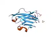 The crystal structure of myelin oligodendrocyte glycoprotein was determined by x-ray diffraction at a resolution of 1.45 Angstrom, using protein from the Norway rat. This protein is 139 residues long, and is a member of the immunoglobulin superfamily.[13] The dssp secondary structure of the protein is 6% helical and 43% beta sheet: there are three short helical segments and ten beta strands.[14] The beta strands are within two antiparallel beta sheets that form an immunoglobulin-like beta-sandwich fold.[15] Several features of the protein structure suggest MOG has a role as an "adhesin in the completion and/or compaction of the myelin sheath." There is a "significant strip" of electronegative charge beginning near the N-terminus and running about half the length of the molecule. Also, MOG was shown to dimerize in solution, and the shape complementarity index is high at the dimer interface, suggesting a "biologically relevant MOG dimer."[16]