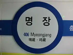 Myeongjang Station (Korean: 명장역; Hanja: 鳴蔵驛) is an underground station of Busan Metro Line 4 in Allak-dong, Dongnae District, Busan, South Korea.