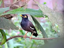 Mynas are not a natural group;[1] instead, the term myna is used for any starling in the Indian subcontinent, regardless of their relationships. This range was colonized twice during the evolution of starlings, first by rather ancestral starlings related to the coleto and Aplonis lineages, and millions of years later by birds related to the common starling and wattled starling's ancestors. These two groups of mynas can be distinguished in the more terrestrial adaptions of the latter, which usually also have less glossy plumage except on the heads and longer tails. The Bali myna, which is critically endangered and nearly extinct in the wild, is highly distinctive.