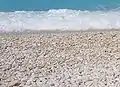 Longshore drift, along with wave energy, has shaped the shore. As waves curve along the beach they also pick up the finest bits of marble; this creates sediment plumes that follow the curve of the beach with the direction of the waves giving the water a shade of turquoise.[3]