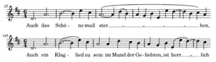 Nänie (the German form of Latin naenia, meaning "a funeral song"[1] named after the Roman goddess Nenia) is a composition for SATB chorus and orchestra, Op. 82 by Johannes Brahms, which sets to music the poem "Nänie" by Friedrich Schiller. Brahms composed the piece in 1881, in memory of his deceased friend Anselm Feuerbach. Nänie is a lamentation on the inevitability of death; the first sentence, "Auch das Schöne muß sterben", translates to "Even the beautiful must die". Typical duration of a performance is approximately 15 minutes.