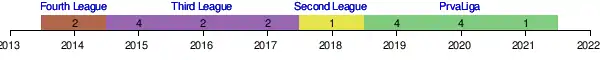| 2018–19 | 1. SNL | 4th | 13–13–10 | Semi-finals |