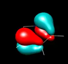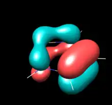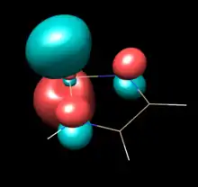 Computational studies and photoelectron spectroscopy create a more nuanced picture of electronic structure and π-electron sharing in NHSis. Relevant π bonding orbitals in unsaturated five-membered NHSis can be understood as the molecular orbital mixing of the diimine backbone's butadiene-like pi orbitals and the 3s and 3p orbitals of Si. Photoelectron Spectra of the unsaturated [tBuN−CH=CH−tBuN]Si: show a HOMO with three peaks at -6.96eV, -7.13eV & -7.28eV, assigned the in-phase overlap of the Si 3py orbital and butadiene-like π3 of the diimine. The HOMO in the tetravalent Si-hydrogenated analog lacks a vacant Si 3py orbital and the energy of the π3 is destabilized to -6.56 eV, supporting charge donation from N to Si in the silylene. The HOMO-1 is the in-plane Si lone pair involved in σ donation. No difference is calculated between the HOMO-2 for the unsaturated silylene compared to the corresponding orbital of the silane analog. The original 1994 Denk at al. photoelectron spectroscopy communication relates this orbital to the π2 diimine orbital, however a 1996 paper from Blakeman et al. designates this as the nitrogen lone pairs. Either way, both orbital assignments are symmetrically forbidden from overlapping with any Si orbital. The HOMO-2 does not change in energy upon hydrogenation at Si indicating that much of the overall electronics are unchanged by hydrogenation and underscoring the effects of N to Si electron π-donation in the HOMO and HOMO-3. Calculations in the former study at the MP4 6-31G* level showed increased energy level spacing for N-H model compounds (instead of N-tBu), but with the same order and proportional spacing.[5][9] The Blakeman study compared the benzo-fused NHSi to the ethylene-like unsaturated NHSi, and found by PES that the HOMO is lower by .36eV and the Si lone pair by .34 eV in the benzo-fused NHSi, suggesting the electron withdrawing power of the phenylene ring makes the benzo-fused NHSi less nucleophilic.[9]
