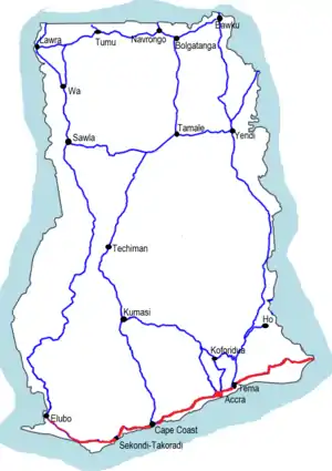 | Major cities | Sekondi-Takoradi, Cape Coast, Winneba, Accra, Tema, Sogakope | |||