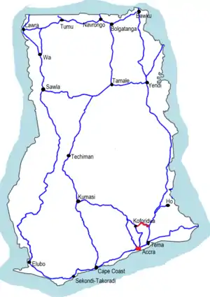 The N3 or National Highway 3 is a national highway in Ghana that begins at Kpong and runs west through Oterkpalu to Koforidua.[1] It is a link between the N2 and N4 in the Eastern region of the country, with a total distance of 40 kilometers (25 miles).
