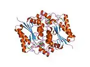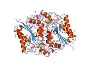 NAD(P)H dehydrogenase, quinone 2, also known as QR2, is a protein that in humans is encoded by the NQO2 gene. It is a phase II detoxification enzyme which can carry out two or four electron reductions of quinones. Its mechanism of reduction is through a ping-pong mechanism involving its FAD cofactor. Initially in a reductive phase NQO2 binds to reduced dihydronicotinamide riboside (NRH) electron donor, and mediates a hydride transfer from NRH to FAD. Then, in an oxidative phase, NQO2 binds to its quinone substrate and reduces the quinone to a dihydroquinone. Besides the two catalytic FAD, NQO2 also has two zinc ions. It is not clear whether the metal has a catalytic role. NQO2 is a paralog of NQO1