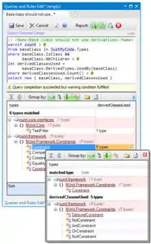 All recent versions of the tool (after V4) provides live code queries and code rules through LINQ queries. This is one of the main innovations of NDepend. For example: