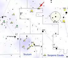 NGC 6633 is a large bright open cluster in the constellation Ophiuchus. Discovered in 1745-46 by Philippe Loys de Chéseaux, it was independently rediscovered by Caroline Herschel in 1783 and included in her brother William's catalog as H VIII.72.[1] Bright enough to be seen with the naked eye, the cluster is considered a fine object for binoculars or small telescopes.[2]