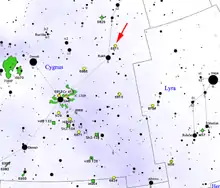 NGC 6811 is an open cluster in the constellation of Cygnus,[3] near the constellation of Lyra.[4] It has an angular size half that of the full Moon and includes about 1000 stars[5] of roughly similar magnitude.[3][6] It has also been called "The Hole in the Cluster" because of its dark center.[6][7]