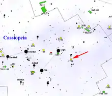 NGC 7789 (also known as Caroline's Rose[4] or the White Rose Cluster) is an open cluster in Cassiopeia that was discovered by Caroline Herschel in 1783. Her brother William Herschel included it in his catalog as H VI.30. This cluster is also known as the "White Rose" Cluster or "Caroline's Rose" Cluster because when seen visually, the loops of stars and dark lanes look like the swirling pattern of rose petals as seen from above.