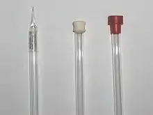An NMR tube is a thin glass walled tube used to contain samples in nuclear magnetic resonance spectroscopy. Typically NMR tubes come in 5 mm diameters but 10 mm and 3 mm samples are known. It is important that the tubes are uniformly thick and well-balanced to ensure that NMR tube spins at a regular rate (i.e., they do not wobble), usually about 20 Hz in the NMR spectrometer.