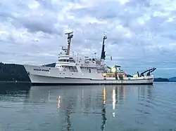 With her home port at Seattle, Ocean Starr is operated for Stabbart Maritime by Ocean Services, Inc. She operates in the Pacific Ocean, sometimes under charter to NOAA. Among other duties, she continues to conduct CalCOFI cruises,[8] and hosts teachers taking part in NOAA′s Teacher at Sea program.[10] In May 2013, she conducted an annual National Marine Fisheries Service cruise along the United States West Coast to survey populations of ichthyoplankton, krill, jellyfish, squid, and other marine life.[11] On July 23, 2015, with the lead oceanographer for The Ocean Cleanup and 15 researchers and citizen scientists on board, she departed San Francisco, California, to operate as one of approximately 30 vessels that took part in the Mega Expedition, in which the vessels cruised in parallel across the Great Pacific garbage patch, covering 3,500,000 square kilometers (1,351,350 square miles) of the Pacific Ocean in an effort to collect more plastic samples in three weeks than had been collected in the previous 40 years combined.[12] In the autumn of 2015, she conducted a survey sponsored by the Government of Mexico of endangered vaquitas off the coast of Mexico.[13] In July 2017, United States Geological Survey scientists spent 21 days aboard Ocean Starr collecting imagery of the Queen Charlotte-Fairweather Fault System off southeastern Alaska.[14]
