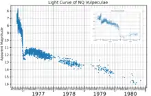 NQ Vulpeculae faded by 3 magnitudes from peak brightness in 65 days, which makes it a "moderate speed" nova. It was one of the first novae to be closely monitored near peak brightness in the infrared.[8] The visual light curve went through a local minimum in January 1977 (resulting in its classification as a DQ Herculis-type nova[9]), and at the same time near infrared (3.5 micron) emission peaked, signalling the formation of a dust shell around the nova.[10] The IRAS satellite was launched a little more than six years after NQ Vulpeculae's outburst, and IRAS detected the nova in the 25, 60 and 100 micron bands.[11]