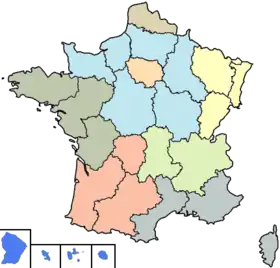 Up until 2016, the first level NUTS regions of France consisted of Ile de France, Bassin Parisien, Nord-Pas-de-Calais, Est, Ouest, Sud-Ouest, Centre-Est, Mediterranee and the Departement d'Outre Mer.[1] The Departement d'Outre Mer consisted of all the overseas departments of France, while the remaining eight statistical regions were made up of the 22 regions of France.