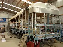 Originally, the 'Wairarapa' railcars had wooden internal framing covered with steel sheathing; however, RM 5's body had decayed so far the decision was made to replace the original wooden framing with steel. This improves the railcar's 'crashworthiness', quite apart from being less maintenance-intensive. Restoration of RM 5 was completed in 2017 after an effort spanning 26 years.[7]