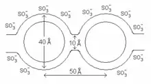 The first model for Nafion, called the cluster-channel or cluster-network model, consisted of an equal distribution of sulfonate ion clusters (also described as 'inverted micelles'[4]) with a 40 Å (4 nm) diameter held within a continuous fluorocarbon lattice. Narrow channels about 10 Å (1 nm) in diameter interconnect the clusters, which explains the transport properties.[3][4][14]