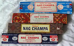Nag champa is commonly used in incense, soap, perfume oil, essential oils, candles, and personal toiletries.[5] It is a popular and recognizable incense fragrance.[6][4]