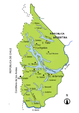 The park covers approximately 7,050 square kilometres (2,720 sq mi). It is located in the southwest section of the Neuquén and northwest section of the Río Negro provinces, bordering with Chile. The park has two zones: the park and the natural reserve with development concentrated in the reserve.[4] The largest city and a base for tourism is San Carlos de Bariloche, which is surrounded by the park. San Carlos de Bariloche is the main hub when visiting the lake, and is known as the "Gateway to Patagonia", the "Chocolate Capital" and the "Honeymoon Capital" of Argentina.[4] However, the city and other settlements are zoned outside the limits of the park. A further subzoning into the north, south and southern zones has been implemented with an exclusive recreational area named the Cerro Cathedral. Villa La Angostura is another lakeside resort also within the boundaries of the park.[2]