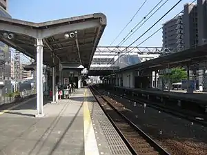 The Osaka Municipal Subway station has an underground island platform serving two tracks. It is the southernmost station on the Osaka subway system.
