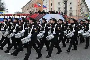 Today, all Nakhimov schools have the traditional honor of opening all Victory Day Parades in their local city with their corps of drums. It also participated in the now defunct October Revolution Day parades. In 2015 Major General Timur Apakidze, a Soviet naval aviation pioneer who had died in a flying accident in 2001, was added to the rolls of the Nakhimov Naval School in perpetuity.[6] The general service march of the schools is the March of Nakhimovtsev (Марш Нахимовцев), written by Vasily Solovyov-Sedoi in 1949.[7] Students at the Nakhimov Naval School and its graduates are known as "Nakhimovites".[8]