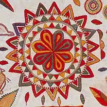 The colourful patterns and designs that are embroidered resulted in the name "Nakshi Kantha",[6] which was derived from the Bengali word "naksha", which refers to artistic patterns.[7] The early kanthas had a white background accented with red, blue and black embroidery; later yellow, green, pink and other colours were also included. The running stitch called "kantha stitch" is the main stitch used for the purpose. Traditionally, kantha was produced for the use of the family. Today, after the revival of the nakshi kantha, they are produced commercially.[9]