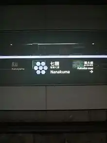 Nanakuma Station (七隈駅) is a subway station on the Fukuoka City Subway Nanakuma Line in Jōnan-ku, Fukuoka in Japan. Its station symbol is a picture of seven hexagon in violet, because seven cars gave the name to Nanakuma in several views.
