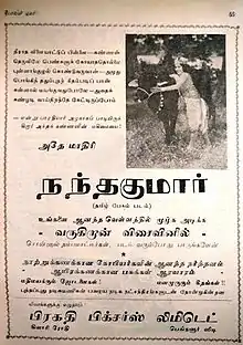 Nandakumar is a 1938 Indian Tamil-language film directed by Keshav Rao Dhaibar. Produced by A. V. Meiyappan, the mythological film features a T. P. Rajalakshmi, C. V. V. Panthulu, and T. S. Rajalakshmi in lead roles. T. R. Mahalingam and T. R. Ramachandran made their cinematic debuts through the film.[2]