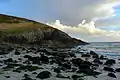 Nanjizal is a cove and valley facing west into the Atlantic Ocean. It is bounded on the north side by the headland of Carn Boel and Trevilley Cliff and to the south is the headland of Carn Lés Boel and Higher Bosistow Cliff.[4] Depending on tides and storms the beach can vary from sand to boulders. On the south is Zawn Pyg (pointed chasm) also known as 'Song of the Sea', an arch where the sea has worn through a tall narrow passageway. The large pools near the zawn are called Big and Little Muzzan (Morzawn, zawn of the sea) and the current that leads from the zawn to the Longships is called Froze Muzzan (current of the sea zawn).[5] Inside the cove are large rock-pools with many types of sea anemones and seaweeds. To the north is a distinctive rock close to the cliff known as the 'Diamond Horse'. There are also a number of other caves further round the beach.