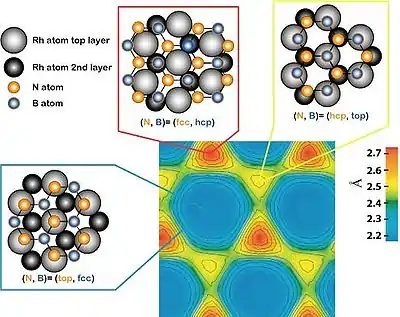 It consists of a single layer of boron (B) and nitrogen (N) atoms, which forms by self-assembly into a highly regular mesh after high-temperature exposure of a clean rhodium[1] or ruthenium[2] surface to borazine under ultra-high vacuum.