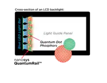 Announced just after CES in January 2010 as part of a commercial agreement with Korean consumer electronics manufacturer and LG subsidiary LG Innotek,[9][10] the quantum rail is a glass capillary optical component containing red and green quantum dots that is inserted between the LEDs and the lightguide panel (LGP) of an LED LCD in manufacturing to improve color gamut.