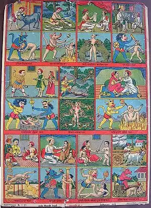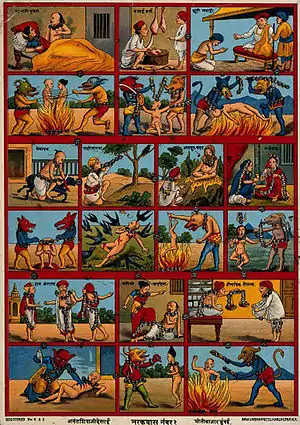 The Yajnavalkya Smriti also lists twenty-one: Tamisra, Lohasanku, Mahaniraya, Salamali, Raurava, Kudmala, Putimrittika, Kalasutraka, Sanghata, Lohitoda, Savisha, Sampratapana, Mahanaraka, Kakola, Sanjivana, Mahapatha, Avichi, Andhatamisra, Kumbhipaka, Asipatravana and Tapana.[12] The Bhagavata Purana, the Vishnu Purana and the Devi Bhagavata Purana enlist and describe 28 hells; however, they end the description by stating that there are hundreds and thousands of hells.[3][4][5][13] The Bhagavata Purana enumerates the following 28: Tamisra, Andhatamisra, Raurava, Maharaurava, Kumbhipaka, Kalasutra, Asipatravana, Sukaramukha, Andhakupa, Krimibhojana, Samdamsa, Taptasurmi, Vajrakantaka-salmali, Vaitarani, Puyoda, Pranarodha, Visasana, Lalabhaksa, Sarameyadana, Avichi, Ayahpana, Ksharakardama, Raksogana-bhojana, Sulaprota, Dandasuka, Avata-nirodhana, Paryavartana and Suchimukha.[3] The Devi Bhagavata Purana agrees with the Bhagavata Purana in most of names; however, a few names are slightly different. Taptasurmi, Ayahpana, Raksogana-bhojana, Avata-nirodhana, Paryavartana are replaced by Taptamurti, Apahpana, Raksogana-sambhoja, Avatarodha, Paryavartanataka respectively.[4] The Vishnu Purana mentions the 28 in the following order: Raurava, Shukara, Rodha, Tala, Visasana, Mahajwala, Taptakumbha, Lavana, Vimohana, Rudhirandha, Vaitaraní, Krimiśa, Krimibhojana, Asipatravana, Krishna, Lalabhaksa, Dáruńa, Púyaváha, Pápa, Vahnijwála, Adhośiras, Sandansa, Kalasutra, Tamas, Avichi, Śwabhojana, Apratisht́ha, and another Avichi.[5]