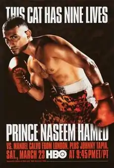 Naseem Hamed had lost his previous fight to Marco Antonio Barrera, giving him first defeat in his professional career and ending his over five year reign as featherweight champion.[2] As per the contract that was signed, Hamed had the option of facing Barrera in an immediate rematch and though he had expressed interest in his post-fight interview, he ultimately decided against it.[3] Hamed eventually announced his intentions to face European featherweight champion Manuel Calvo, who was coming off arguably his biggest victory over former WBO featherweight champion Steve Robinson. However as Calvo was an unknown fighter in the United States, HBO, with whom Hamed had an exclusive contract allowing them to air his fights in the US, objected to Hamed's choice of opponent. Rather than relent as he had the previous year when HBO objected to a proposed Hamed–István Kovács bout,[4] Hamed opted to sever ties with HBO.[5] The fight was also met with several delays. Prior to their separation, HBO offered Hamed a fight to take place on September 8, 2001, but Hamed declined, opting to face Calvo on November 10, 2001 instead. However Hamed postponed the fight as a result of the September 11 attacks.[6] The fight was next rescheduled for March 23, 2002, but a back injury suffered by Hamed during training caused the fight to be postponed again.[7] The fight was then finally set for May 18, 2002.[8]