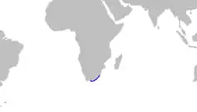 The distribution of the Natal shyshark is restricted to the waters off the KwaZulu-Natal, and possibly also the Western Cape and Eastern Cape Provinces of South Africa. Its total range is estimated to encompass an area of under 100 km2 (39 sq mi).[1] A benthic species, it can be found in the surf zone and on shallow rocky reefs.[2] As opposed to the puffadder shyshark, which inhabits deeper, cooler waters in the northeastern parts of its range, in those areas the Natal shyshark occurs in warm inshore waters at a depth of 0–30 m (0–98 ft).[4]