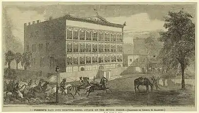Forrest led other raids that summer and fall, including a famous one into Union-held downtown Memphis in August 1864 (the Second Battle of Memphis)[115] and another on a major Union supply depot at Johnsonville, Tennessee. On November 4, 1864, during the Battle of Johnsonville, the Confederates shelled the city, sinking three gunboats and nearly thirty other ships and destroying many tons of supplies.[116] During Hood's Tennessee Campaign, he fought alongside General John Bell Hood, the newest commander of the Confederate Army of Tennessee, in the Second Battle of Franklin on November 30.[117] Facing a disastrous defeat, Forrest argued bitterly with Hood (his superior officer) demanding permission to cross the Harpeth River and cut off the escape route of Union Maj. Gen. John M. Schofield's army.[118] He eventually made the attempt, but it was too late.