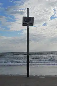 The location of Nathan F. Cobb's wreck is designated by a sign to warn swimmers. It is anchored in or near the water's edge depending on the tide. The hull of the ship became visible for brief period in May 2004 after shifting sands and a very low tide coincided simultaneously. The sign is located at 29°16′38″N 81°1′53″W on Ormond Beach.[6] Previously, a large boulder had been sent from Freed Waterhouse's hometown of Cape Elizabeth, Maine, decorated with a bronze plaque commemorating his brave rescue efforts. This monument was prominently placed in the sand dunes near the site where the ship ran aground, but in July 1972 the plaque was vandalized and broken off. After the plaque was reattached to the boulder, it was relocated to the Fire station north of the Casa Del Mar on A1A, where it currently sits.[5]