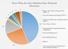 In the 2015 parliamentary election, the People's Movement for Progress party received 51.3% of the national vote, winning 55 seats. The Union for Progress and Change, or UPC, received 20.5% of the vote, which won them 33 seats. The Congress for Democracy and Progress party won 18 seats with 13.2% of the vote, and the New Alliance of Faso party received two seats, with 4.1% of the vote.