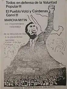 The National Democratic Front had its origins in the PRI, where the Democratic Current - founded in 1986 and led by Cuauhtémoc Cárdenas, Porfirio Muñoz Ledo, César Buenrostro, Ifigenia Martínez, among others - tried to democratize the internal selection of the PRI's presidential candidate, while also protesting against the economic policies of then-president Miguel de la Madrid.[1] When in October 1987 Carlos Salinas de Gortari was nominated the official PRI candidate De la Madrid, the members of the Democratic Current broke from the PRI, looking for a party to support Cárdenas' presidential candidacy.