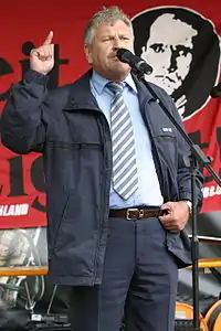 The party is a neo-Nazi organization[8][20][21][22][23] and has been referred to as "the most significant neo-Nazi party to emerge after 1945".[24] The German Federal Agency for Civic Education, or BPB, has criticized the NPD for working with members of organizations which were later found unconstitutional by the federal courts and disbanded,[25][26] while the Federal Office for the Protection of the Constitution (German: Bundesamt für Verfassungsschutz), Germany's domestic security agency, classifies the NPD as a "threat to the constitutional order" because of its platform and ideology, and it is under their observation.[27] An effort to outlaw the party failed in 2003, because the government had many informers and agents in the party, some in high position, who had written part of the material used against them.[28] Since its founding in 1964, the NPD has never managed to win enough votes on the federal level to cross Germany's 5% minimum threshold for representation in the Bundestag; it has succeeded in crossing the 5% threshold and gaining representation in state parliaments 11 times, including one-convocation entry to seven West German state parliaments between November 1966 and April 1968 and two-convocation electoral success in two East German states of Saxony and Mecklenburg-Vorpommern between 2004 and 2011.[29] Since 2016, the NPD has not been represented in state parliaments again. Udo Voigt led the NPD from 1996 to 2011.[27] He was succeeded by Holger Apfel,[30] who in turn was replaced by Udo Pastörs in December 2013. In November 2014, Pastörs was ousted and Frank Franz became the party's leader. Voigt was elected the party's first Member of the European Parliament in 2014. The party lost the seat in the 2019 European Parliament election.