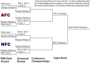 Following the addition of the former AFL teams into the NFL in 1970, the NFL split into two conferences with three divisions each. The expanded league, now with twenty-six teams,[29] would also feature an expanded eight-team playoff, the participants being the three division champions from each conference as well as one 'wild card' team (the team with the best win percentage) from each conference. In 1978, the league added a second wild card team from each conference, bringing the total number of playoff teams to ten, and a further two wild card teams were added in 1990 to bring the total to twelve. When the NFL expanded to 32 teams in 2002, the league realigned, changing the division structure from three divisions in each conference to four divisions in each conference. As each division champion gets a playoff bid, the number of wild card teams from each conference dropped from three to two.[41] The playoffs expanded again in 2020, adding two more wild card teams to bring the total to fourteen playoff teams.[42]