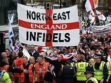 The National Front cooperated with the North West Infidels and South East Alliance, groups that splintered from the English Defence League (rally depicted).[104]