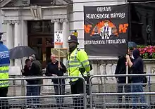 National Front members protesting against growing legal recognition of LGBT rights at the London LGBT Pride march in 2007. The party has tried to protest against various Pride parades in the past.[243]