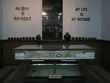 The National Gandhi Museum Gallery has a large number of paintings and personal items of Mahatma Gandhi. The most notable items in the collection are a Satyagraha woodcut by Willemia Muller Ogterop, one of Gandhi's walking sticks, the shawl and dhoti worn by Gandhi when he was assassinated, one of the bullets that were used to kill Gandhi and his urn.[5] The Museum also displays some of Gandhi's teeth and his ivory toothpick.[6] Galleries of the museum are martyrdom gallery, commemorative gallery, art gallery where arts made on Gandhi is open for viewing. Museum also includes a general photo gallery.