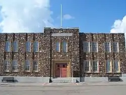 The National Guard Armory is a history armory building at DeQueen and Maple Streets in Mena, Arkansas. It is a large single-story Art Deco building, fashioned out of fieldstone and concrete in 1931. It is the best example in Mena of a stone building style more typically found in the more mountainous surrounding areas. It was designed by Derwood F. Kyle of Pine Bluff, and was from the start designed to include community meeting spaces, a function the building continues to perform.[2]