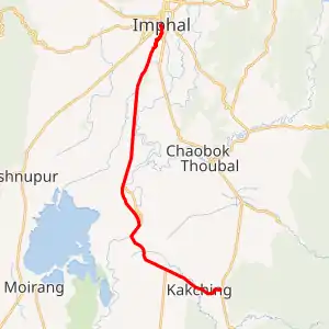 Wahengbam Leikai(Junction of Imphal-Mayang Imphal road and NH 37), Hiyangthang, Wangol, Mayang Imphal, Wabagai, Kakching, Kakching Lamkhai.[1][2][3]