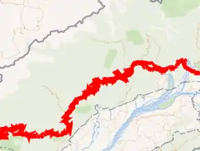 National Highway 13 (NH 13), part of the larger Trans-Arunachal Highway network, is a 1,559 km long two-lane national highway across Arunachal Pradesh in India running from Tawang in northwest to Wakro in southeast.[1][2] Entire route became operational in 2018 when 6.2 km long Dibang River Bridge was completed across Dibang River.[3][4] Sela Tunnel, a shorter alternative route with target completion by Jan/Feb 2022, will provide all-weather connectivity.[5][6] Before the renumbering of highways, it was known as NH 229 and NH52.[7] This strategically important highway enhances Indian military's capabilities in combating the threat of China's Western Theater Command opposite India's eastern sector of Line of Actual Control.