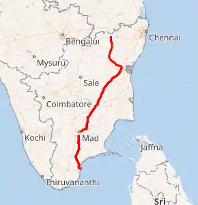 The National Highway NH-38 originates from Vellore and terminates at Thoothukudi.[2] It passes through the major cities of Tamilnadu.[3][4] The cities and towns includes ( from Vellore to Thoothukudi) Polur, Tiruvannamalai, Villupuram, Ulundurpettai, Perambalur, Trichy, Melur, Madurai, Aruppukottai, Ettayapuram.[5]