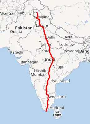 It passes through the Union Territory of Jammu and Kashmir, in addition to the states of Punjab, Haryana, Delhi, Uttar Pradesh, Rajasthan, Madhya Pradesh, Maharashtra, Telangana, Andhra Pradesh, Karnataka, and Tamil Nadu.[1]